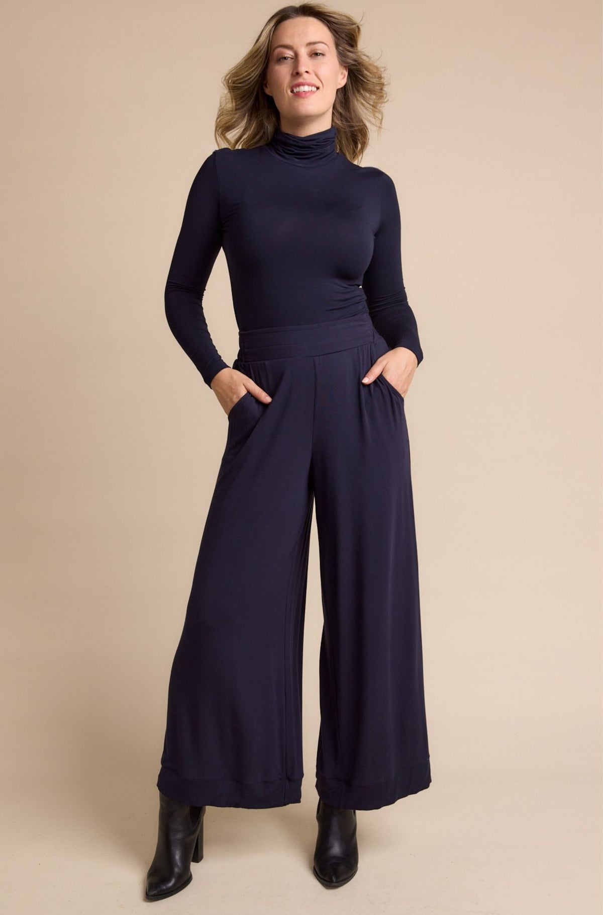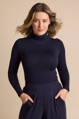 The perfect layering piece, the Skivvy is crafted from buttery soft, lightweight Micro Modal Air with a smooth skivvy neckline. An enduring Tani staple with a versatile body-fit cut for effortless styling. Available in French Navy.